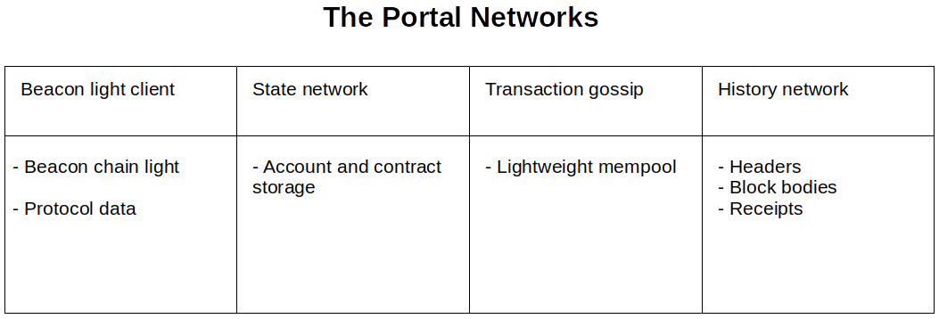 El objetivo de Portal Network es replantear todo el diseño, creado específicamente para la ligereza, fuera de las restricciones de diseño de los clientes existentes de Ethereum.