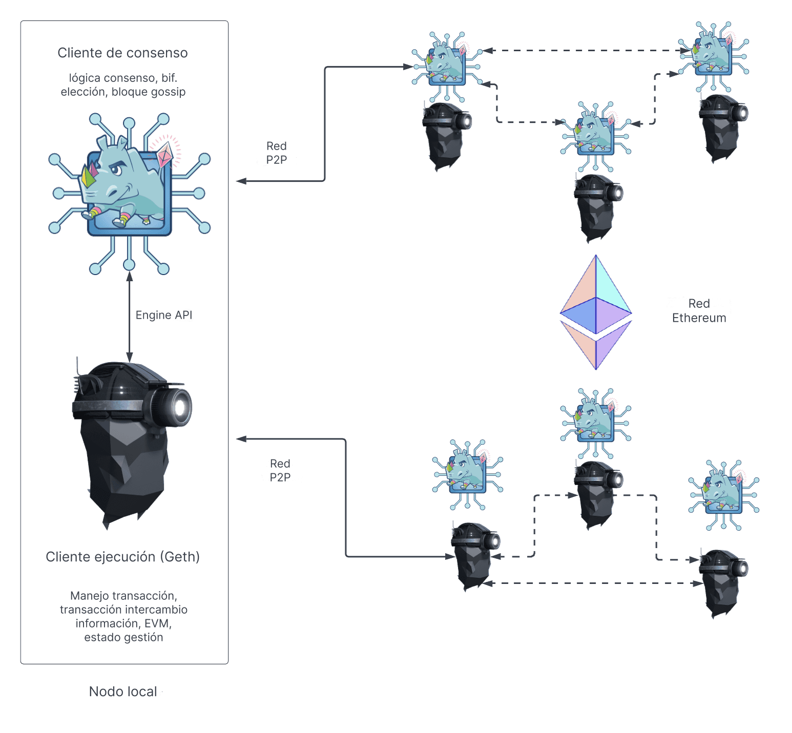 El siguiente diagrama muestra la relación entre los dos clientes Ethereum. Los dos clientes se conectan a sus respectivas redes entre pares (P2P). Se necesitan redes P2P separadas, ya que los clientes de ejecución envían transacciones con protocolo de intercambio de información (o Gossip) a través de su red P2P, lo que les permite administrar su reserva de transacciones local, mientras que los clientes de consenso envían por Gossip bloques de su red P2P, lo que permite el consenso y el crecimiento de la cadena.