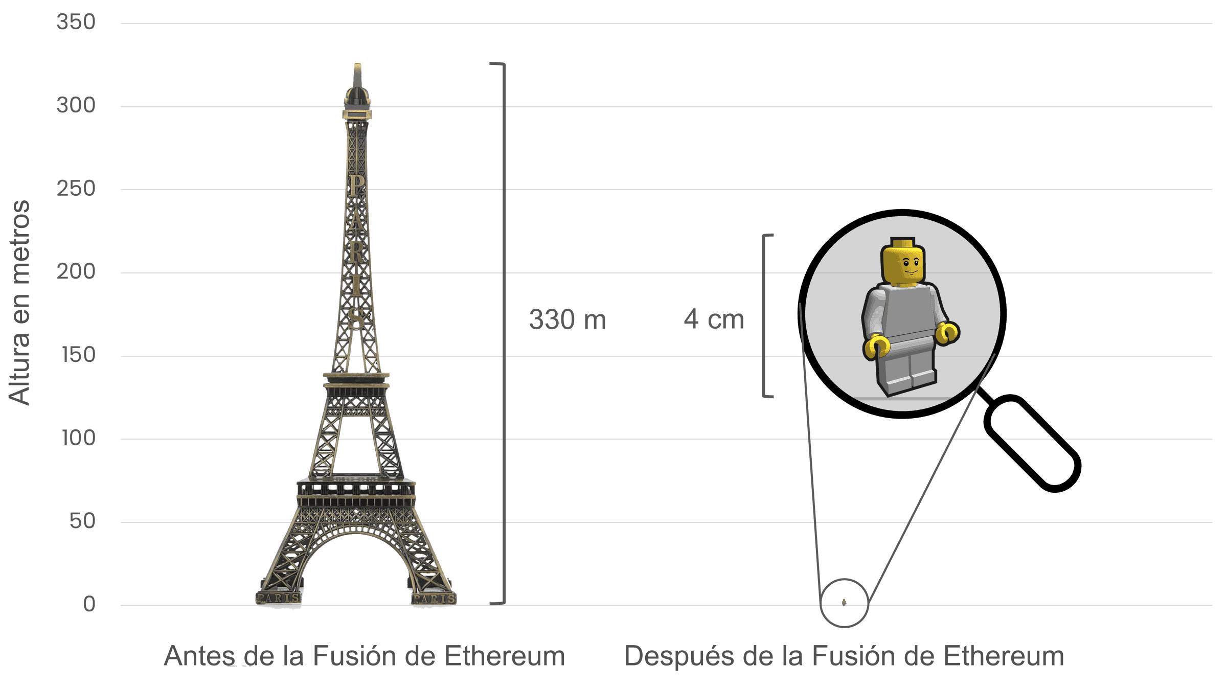 CCRI estima que La Fusión redujo el consumo anual de energía de Ethereum más de un 99,988 %. Del mismo modo, la huella de carbono de Ethereum se redujo un 99,992% aproximadamente (de 11.016.000 a 870 toneladas de CO2e). Para ponerlo en contexto, la reducción en las emisiones es como pasar de la altura de la torre Eiffel a un pequeño muñeco de juguete, como se ve en la figura anterior. Como resultado, el costo ambiental de asegurar la red se reduce drásticamente. Al mismo tiempo, se cree que la seguridad de la red ha mejorado.