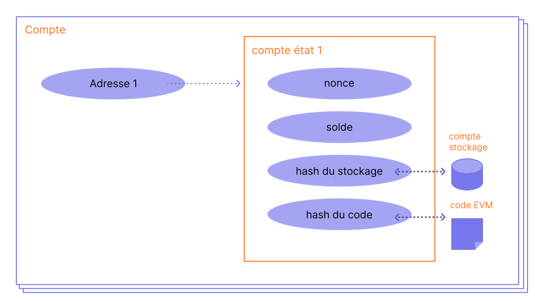 nonce- Il s'agit soit d'un code indiquant le nombre de transactions envoyées à partir d'une adresse émettrice, soit du nombre de contrats créés auxquels vous pouvez avoir accès par le biais de la page dédiée aux contrats et aux adresses Ethereum (Account). Chaque adresse Ethereum (Account) peut être utilisée uniquement à chaque transaction en choisissant un nonce associé au bloc. Le rôle de ce dernier est de rendre impossible les attaques par rejeu, durant lesquelles des transactions signées sur une chaîne, sont réalisées et retransmises de manière continue sur l'autre chaîne.balance– le nombre de wei possédés par cette adresse. Le wei est une unité divisionnaire de l'ETH. Il y a 1e+18 wei pour 1 ETH.codeHash– ce hash est une référence au code d'un compte dans la machine virtuelle Ethereum (EVM). Les comptes de contrat possèdent des fragments de code qui peuvent réaliser différentes opérations. Ce code EVM est exécuté si le compte reçoit un message. Contrairement aux autres champs, il ne peut pas être modifié. Tous ces fragments de code sont stockés dans une base de données à états, sous leur hachage correspondant, pour une récupération future. Cette valeur de hachage est connue en tant que codeHash. Pour les comptes externes, le champ du codeHash contient le hachage d'une chaîne vide.storageRoot– Parfois connu sous le nom de hachage de stockage. Un hash 256 bits du nœud racine d'un arbre de Merkle qui encode le contenu de stockage du compte (une correspondance entre 256 bits entiers), encodé dans un arbre préfixé comme correspondance d'un hach Keccak 256 bits des clés d'entier en 256 bits en des valeurs entières encodées en RLP. Cet arbre encode le hash des contenus stockés de ce compte, et est vide pas défaut.